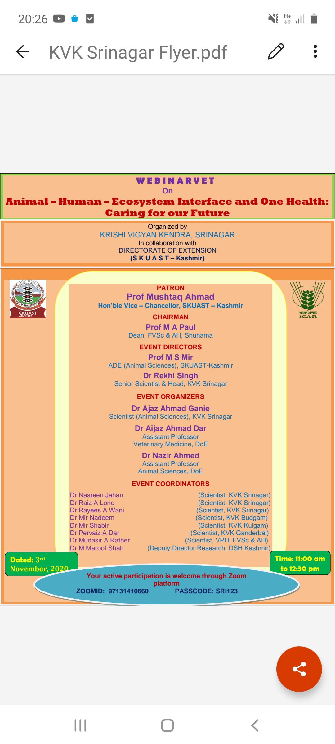 A Webinar and theme based interaction on the topic mentioned is being held on November 3 to highlight the importance of the day and need for promotion of Animal, human and environmental health in a coordinated manner so as to live a safe and secure life.