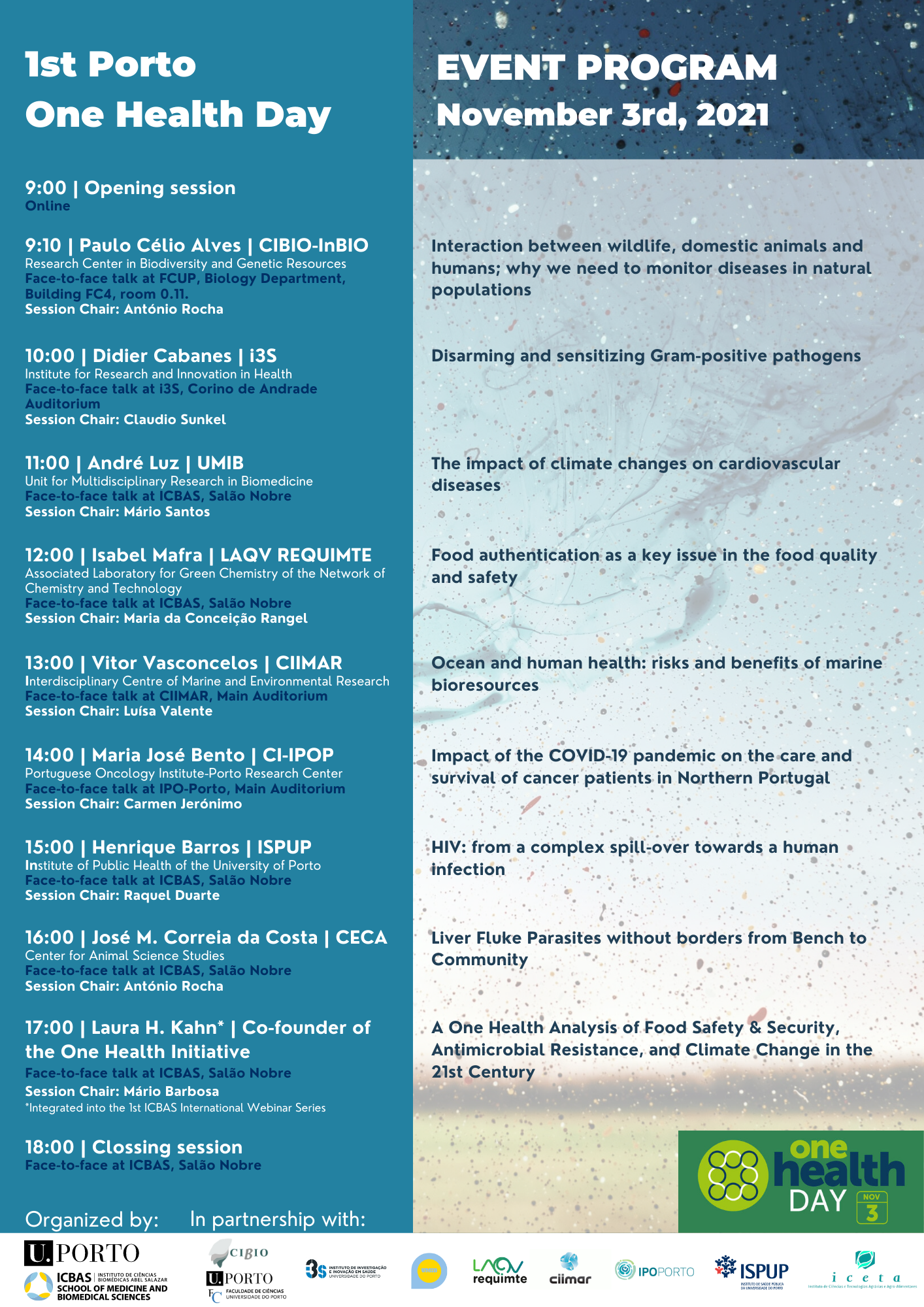 The talks of the '1st Porto One Health Day' will have a hybrid format: face-to-face, from different places, but will also be transmitted through the Zoom platform.