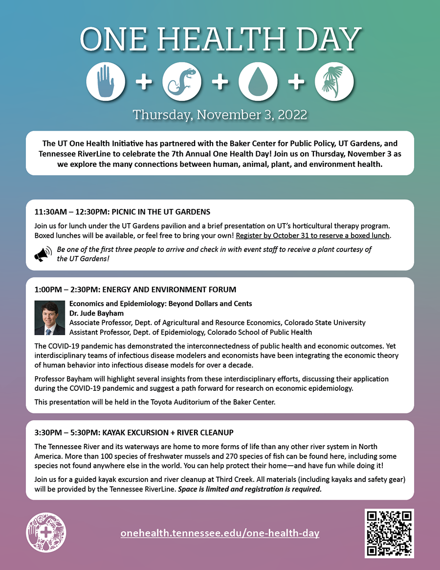 The UT One Health Initiative has partnered with the Howard H. Baker Jr. Center for Public Policy, UT Gardens, and Tennessee RiverLine to celebrate the 7th Annual World One Health Day! Join us on Thursday, November 3 as we explore the many connections between human, animal, plant, and environment health.