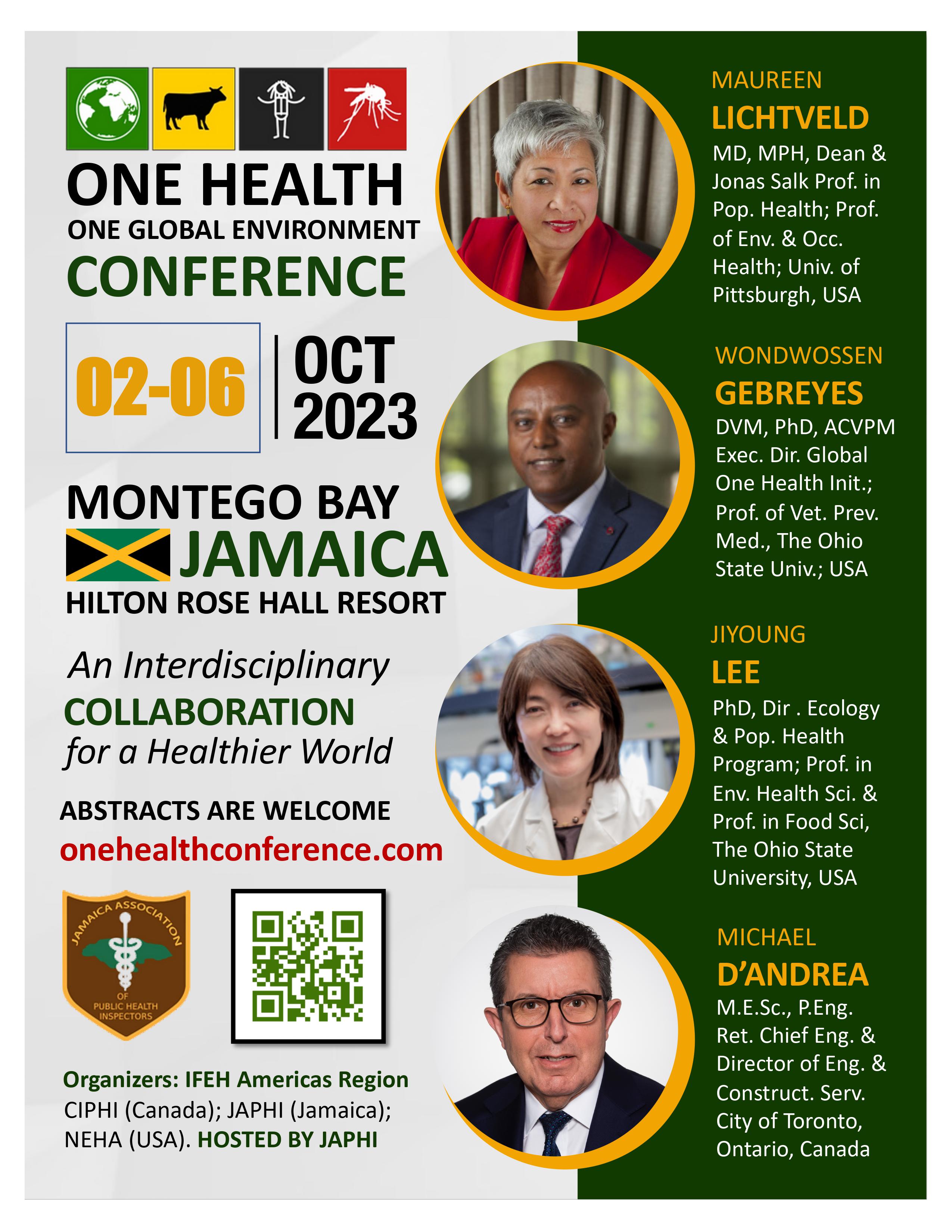 The 2023 Conference will be occurring in the month leading up to One Health Day at the Hilton Rose Hall in Montego Bay. Conference Purpose: Environmental Health provides a critical link to protecting human health from human-to-human, vector-borne, and zoonotic diseases. This gathering of academics and practitioners will use discussions and presentations about new surveillance techniques, diagnostics, disease prevention strategies, policies, academic curriculum design, and much more to foster networking and One Health capacity building within the global environmental health community.