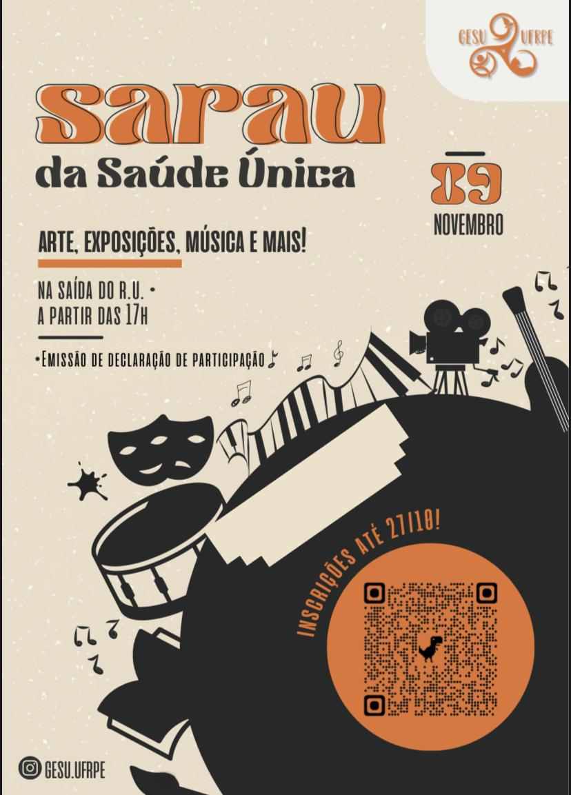 Welcome to the Single Health Event (Sarau), an event that seeks to explore the intersection between health and artistic expressions, offering a space for members of the academic community of UFRPE, UFPE and UPE to reflect, debate and share their perspectives on One Health through various forms of art, such as photo exhibition, illustration/drawing, painting, poem, poetry and string literature.
